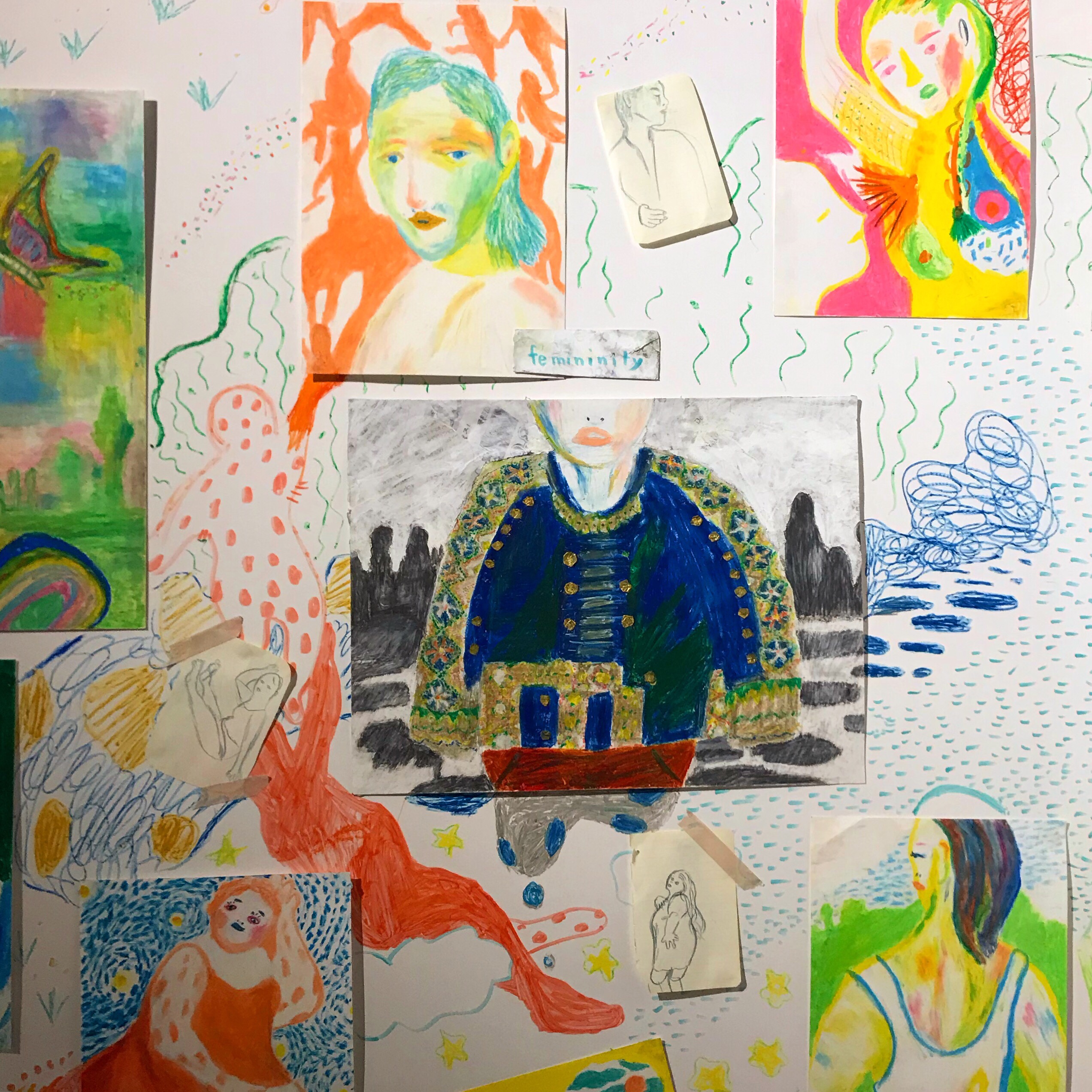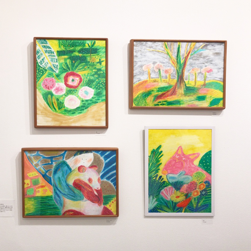 私は日常生活の中で、私の視点から見た風景を作品にしました。自転車の駐輪場に生えた苔の上に落ちた赤い椿、youtubeで見た飼育員さんに運ばれるパンダ、春先のまだ暗い世界に春一番に色を加える梅の花、幼少期に花畑を歩いていた近所の犬。