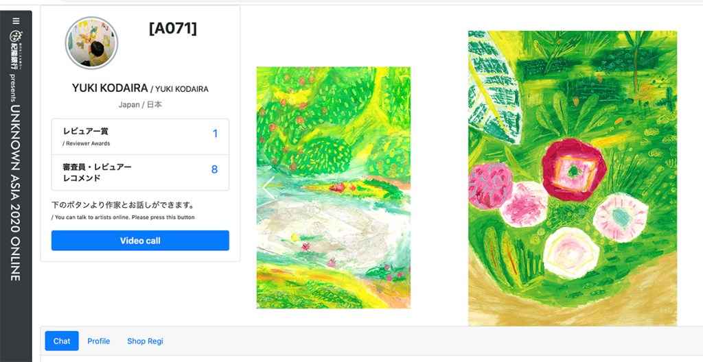 UNKNOWN ASIAは、2015年から関西で開催されてきた、海外からのアーティストも参加する国際的なアートフェアです。今年は、コロナの感染拡大状況を受け、初のオンライン開催となりました。こちらに参加させていただき、特設サイトで作品の展示、チャットやビデオ通話などで来場者やアーティストやレビュアーのみなさんと交流をいたしました。絵画やイラストレーション、インスタレーションなど様々な文脈の作品が出展され、私も出展者であるにもかかわらずとても楽しませていただきました。また、レビュアー賞(チュイチェン賞)とレビュアーと審査員からの8名のレコメンドをいただきました。