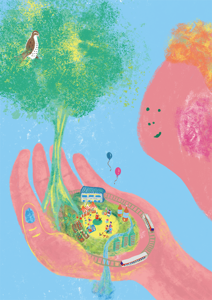 流山おおたかの森に遊びに行くと感じるのは、穏やかな生活の雰囲気。この街を流れる穏やかな雰囲気は、自然にできたものではなく、街に関わる人々によってつくられてきたからこそではないでしょうか。2021年にリニューアル予定の広場も、この街に関わるさまざまな人々の手によって、年月が経つほどに、より居心地の良い場所につくられていくことを願い、この絵を描きました。